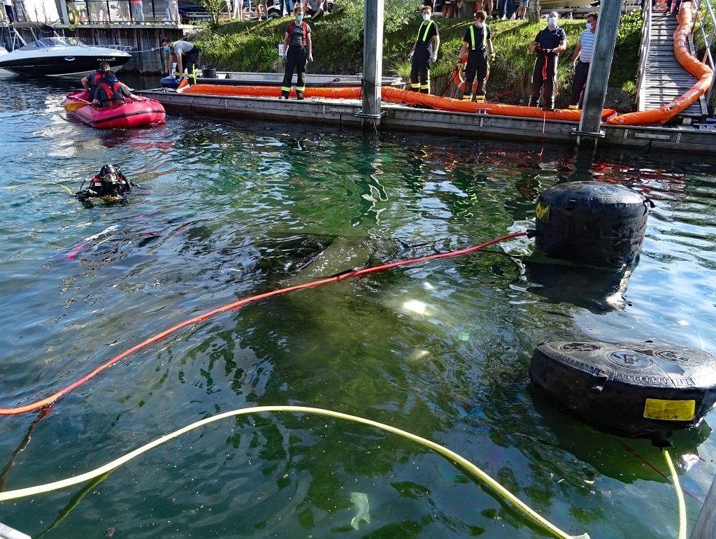 Deprecated: Function utf8_encode() is deprecated in /homepages/45/d16775473/htdocs/feuerwehr/html/einsaetze_show.html on line 146 Mit der Meldung „PKW im Wasser“ rückte die Feuerwehr Langenargen am Mittwochnachmittag in den BMK-Yachthafen aus. Der Fahrzeugführer des ersteintreffenden Löschfahrzeuges erkundete zunächst die Lage. Beim Auswassern rutschte ein Fahrzeug mitsamt Trailer und Boot in das Hafenbecken. Der erst fünf Monate alte SUV befand sich bei der Ankunft der Feuerwehr komplett unter Wasser, glücklicherweise befanden sich keine Personen in Gefahr. Zur Bergung wurden weitere Kräfte nachgefordert: Gerätewagen-Transport mit Ölsperrenanhänger der Feuerwehr Langenargen, Gerätewagen-Transport-Kran und Rüstwagen der Feuerwehr Friedrichshafen und Einsatztaucher der DLRG Bodensee. Um eine Wasserverschmutzung durch auslaufende Betriebsstoffe zu verhindern, wurden mithilfe eines Schlauchbootes vorsichtshalber Ölsperren ausgebracht und Ölschlängel eingesetzt. Einsatztaucher der DLRG hoben den PKW mit Luftsäcken an, sodass dieser mit der Seilwinde des Rüstwagens an Land gezogen werden konnte. Erst gegen 18:30 Uhr konnte auch der Einsatz im BMK-Hafen abgeschlossen werden. Weitere Einsatzkräfte: Feuerwehr Friedrichshafen mit RW und GW-T-Kran DLRG Bodensee Einsatztaucher Wasserschutzpolizei |